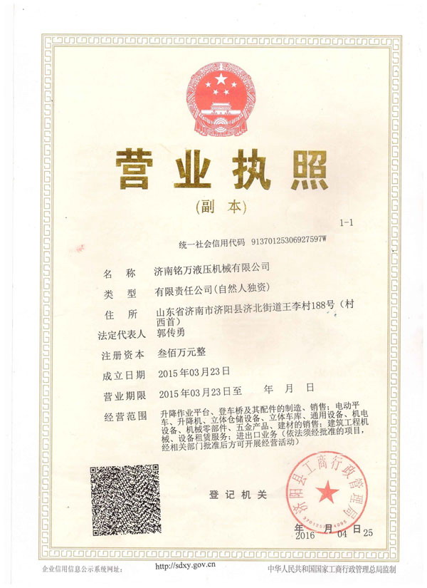 濟南銘萬液壓機械有限公司【原濟南機械廠】,是全國制造液壓升降機、升降平臺的廠家,產品有八大系列六十多個品種,規格齊全、質量穩定、安全可靠、方便快捷;產品銷往全國各地,深受用戶好評。升降機廠家技術力量雄厚,產品設計先進、工藝成熟、實驗檢測手段完善,“質量第一,用戶至上”是我們的宗旨。 本公司采用先進的管理手段,嚴密的質量監控體系和良好的售后服務隊伍為我們的產品走向市場創造......
